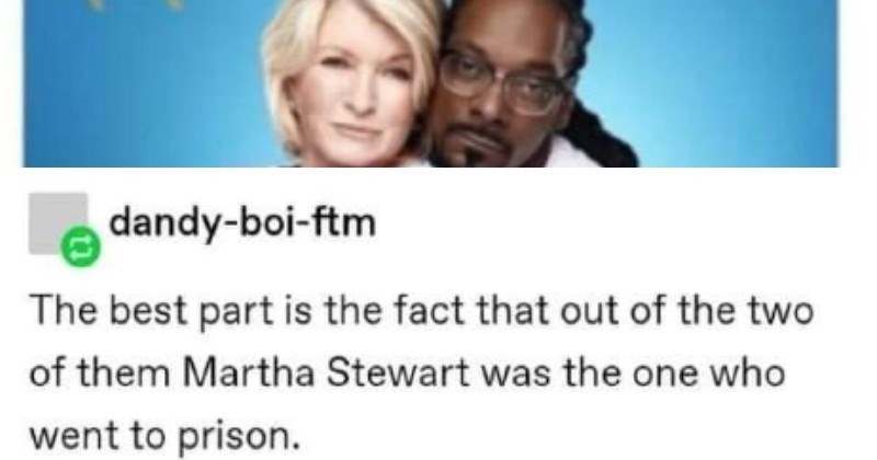 For starters Snoop is married and at 48 he is nearly a decade younger than Marthas daughter. As youre probably aware Snoop has a close friendship with Martha Stewart. Jean Baptiste Lacroix AFP Getty Images And as youre ALSO probably aware Martha. Snoop decided to post a reminder to all of his followers in a meme that read. Weed may be a huge part of Snoops world and persona but that doesnt mean Stewart was hitting a. Make Martha and Snoop memes or upload your own images to make custom memes. Two prior felony convictions drugs in 1990 and possession of a firearm by a convicted felon in 1997 were admitted to by Broadus his real name as part of the plea agreement. Martha Snoops Potluck Dinner Party. He correctly presumes that most people would look at this pair and pick him a.